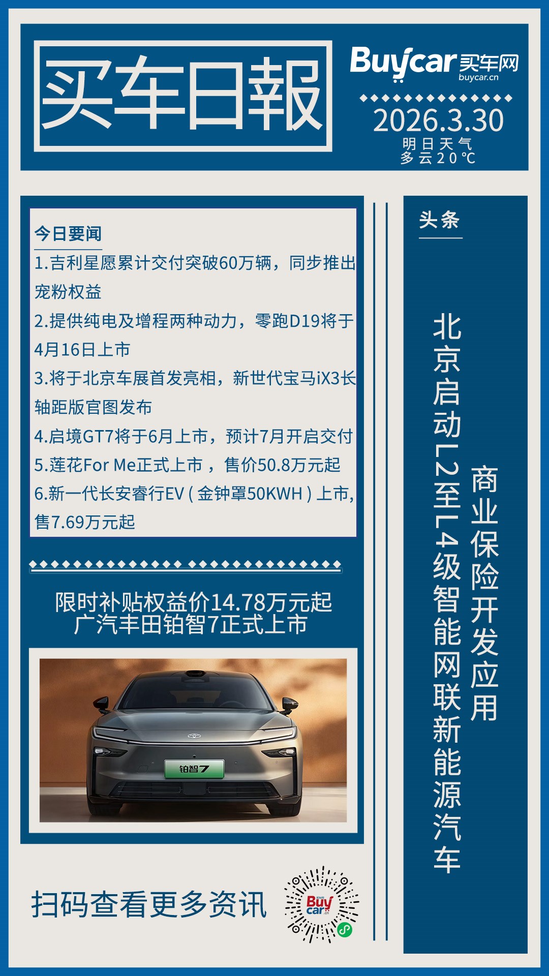 买车日报-20260330-北京启动L2至L4级智能网联新能源汽车商业保险开发应用