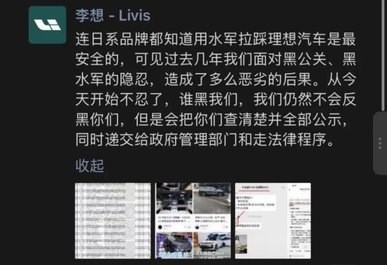 当日晚间,李想再次发动态称,这一把直接玩大的,晒出黑水军证据。